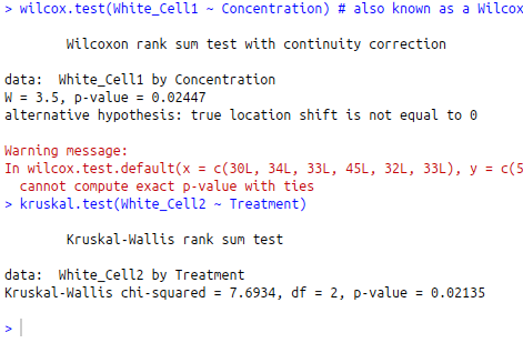 Also note - R has produced a warning message here. Ranking data can sometimes cause ties, and such messages are common with small datasets. Don't worry about warning messages when the results seem to make sense, and support what you would have found from looking at graphs.