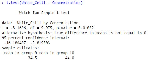 As a default, R automatically chooses a t-test which doesn't not require equal variances. It is interpreted the same way as the p value for SPSS above. If the p value is less than 0.05, then the difference between the sample means is considered significant.